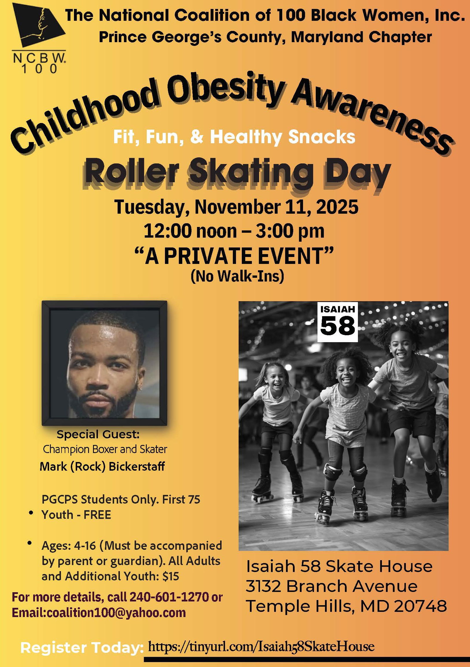Join us for NCBW-PGC Childhood Obesity Awareness Roller Skating Day! Get ready to lace up your skates and roll with us at Isaiah 58 Skate House for a day of fun and awareness. Cost: FREE for the first 75 youth The event is for PGCPS children ages 4 to 16 years old, and they MUST be accompanied by a Parent/Guardian or Adult Chaperone. The cost is $15 for adults and additional youth. Contact HealthAwareness@ncbwpgc.net for more information. See you there!