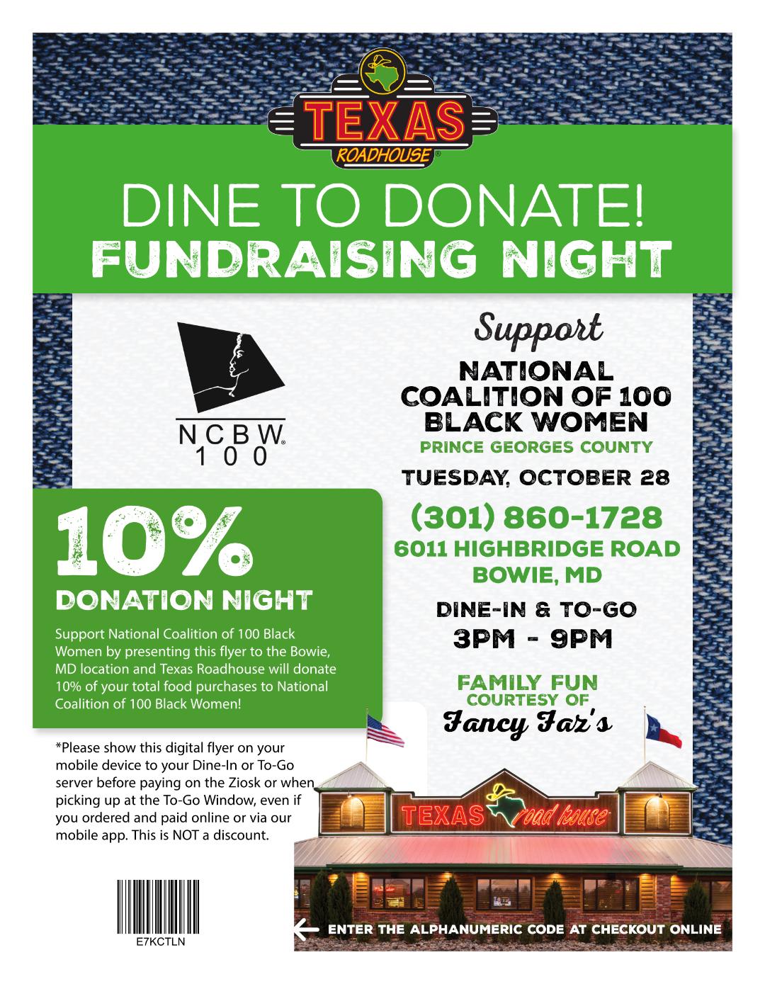 Join the National Coalition of 100 Black Women, Prince George’s County Maryland Chapter for our 'Texas Roadhouse Dine to Donate Fundraising Night,' where you can enjoy delicious meals while contributing to a worthy cause. A portion of the proceeds will benefit our chapter. Don't miss this opportunity to make a difference and savor a fantastic dining experience. Bring your family and friends!