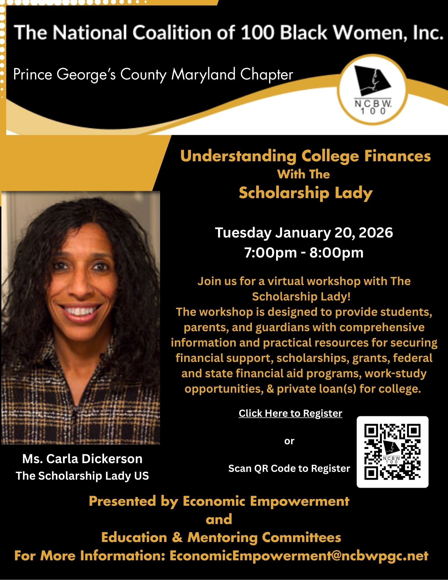 Join Us for a Virtual Workshop with The Scholarship Lady! We are pleased to invite students, parents, and guardians to a special virtual workshop presented by The Scholarship Lady. This informative session is designed to provide comprehensive guidance and practical resources for securing financial support for college. Topics will include: Scholarships and grants Federal and state financial aid programs Work-study opportunities Private loan options Whether you are planning for college or currently enrolled, this workshop will offer valuable insights to help you navigate the financial aid process with confidence. We hope you will join us for this important event!